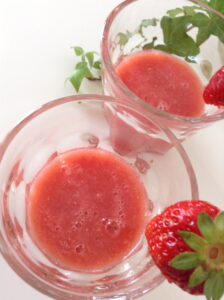 - ポイントは水分量の多い果物から先にいれていくこと。この場合は、イチゴ、梨の順番だと、水をいれなくてもミキサーがまわりやすい。